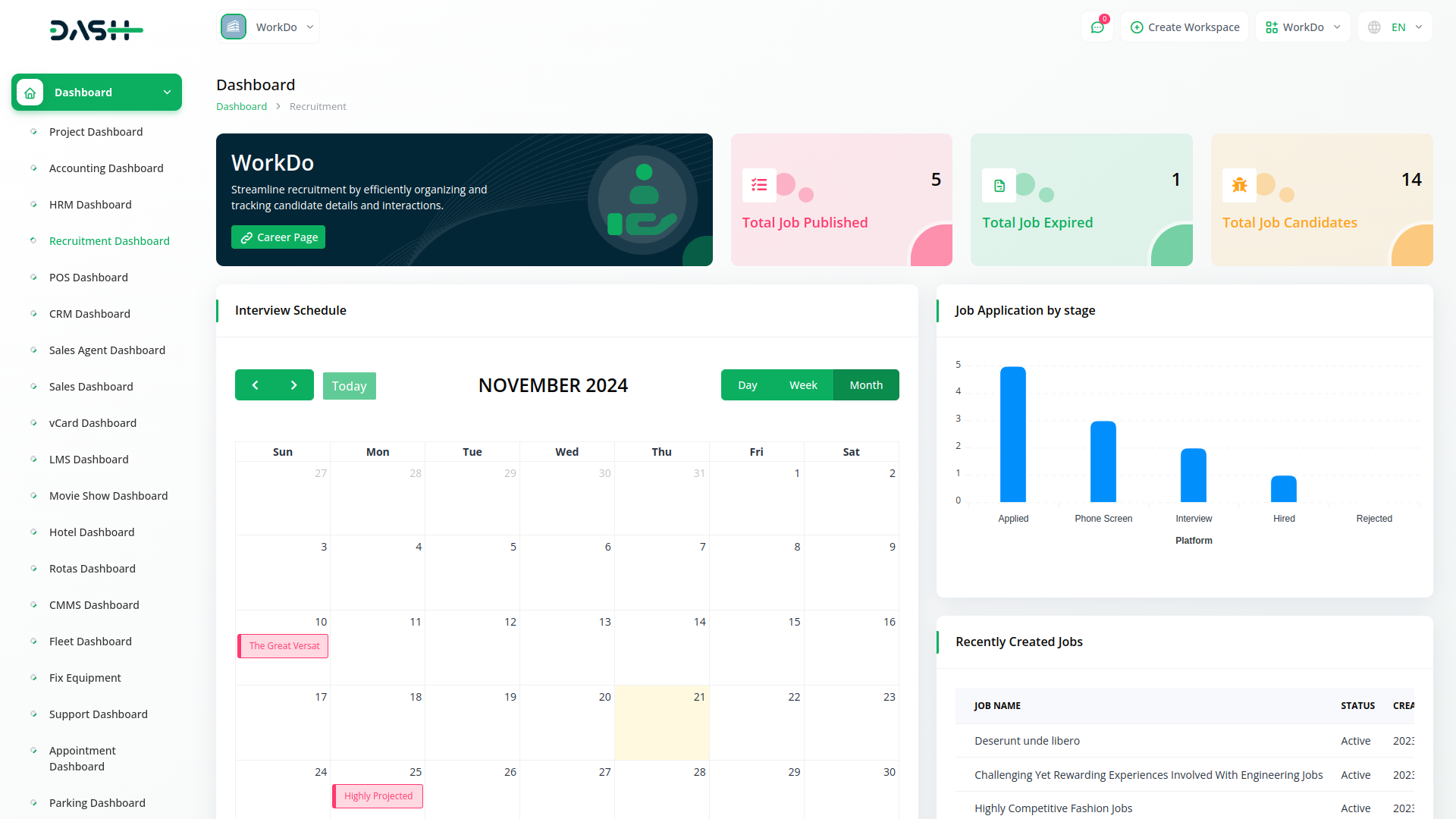 The Dashboard of Recruitment module provides users with an immediate overview of their recruitment activities. It presents key metrics such as the total number of jobs published, expired listings, and the current count of job candidates. Additionally, users can easily view their interview schedule through an interactive calendar and stay updated on recently created job listings and job applications by date. This real-time monitoring tool empowers users to make informed decisions and effortlessly stay on top of their hiring processes.