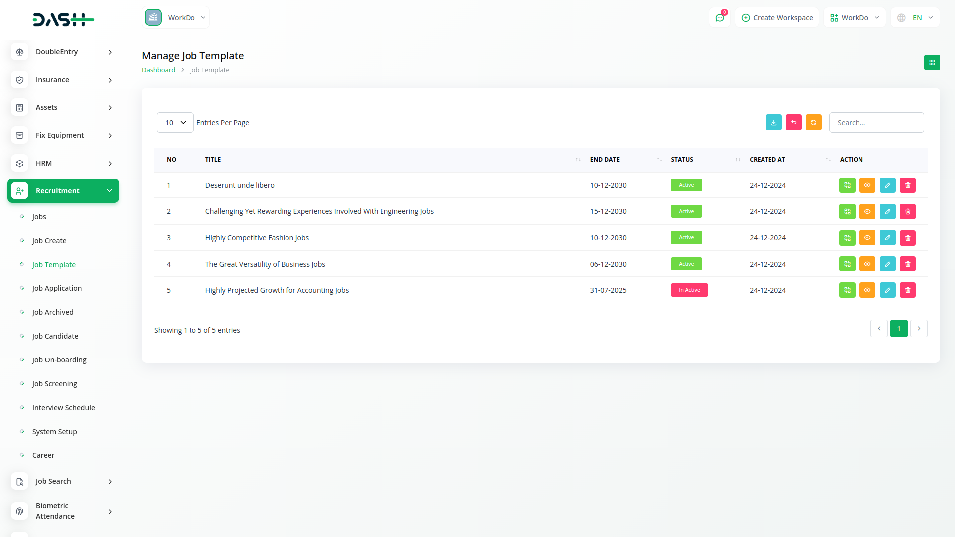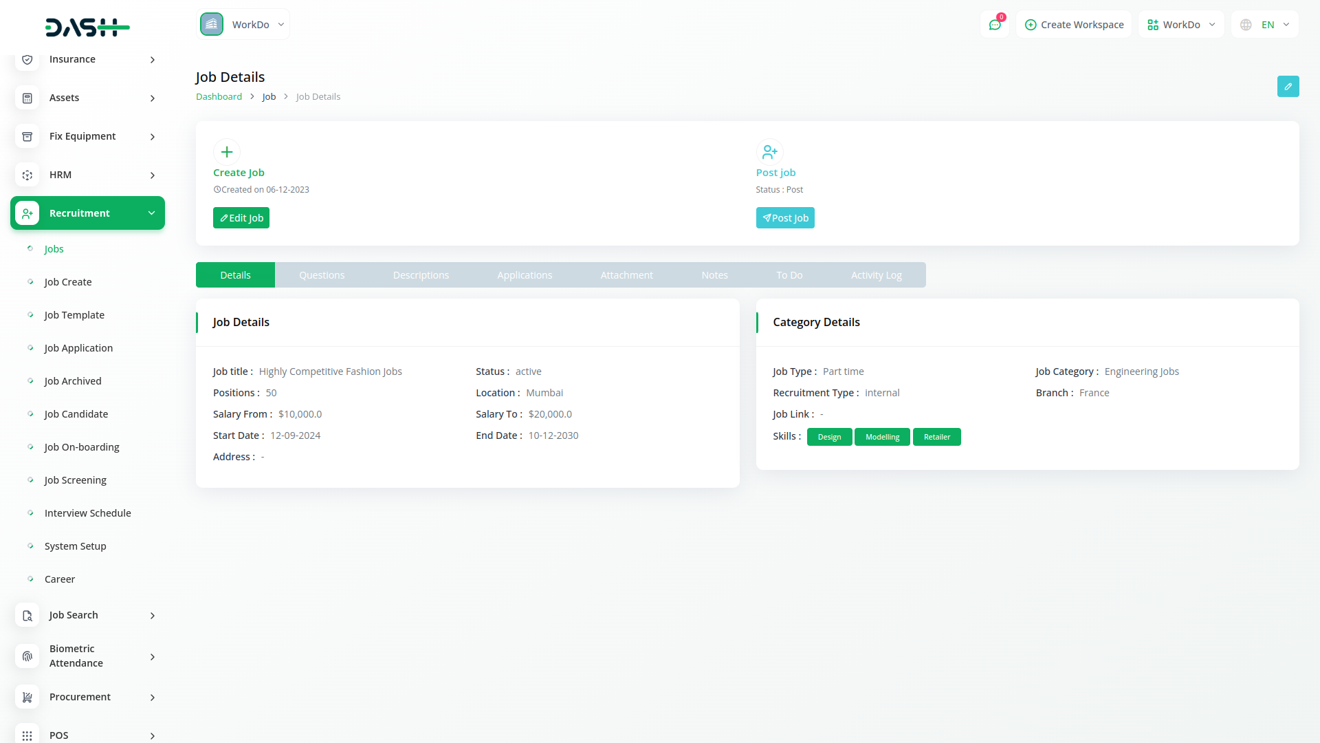 In the Recruitment module, users can view comprehensive job details, including descriptions, questions, applications, attachments, notes, to-do lists, and activity logs. This feature ensures all relevant information is accessible in one place, streamlining the job posting process and allowing for better organization and management of each job listing.