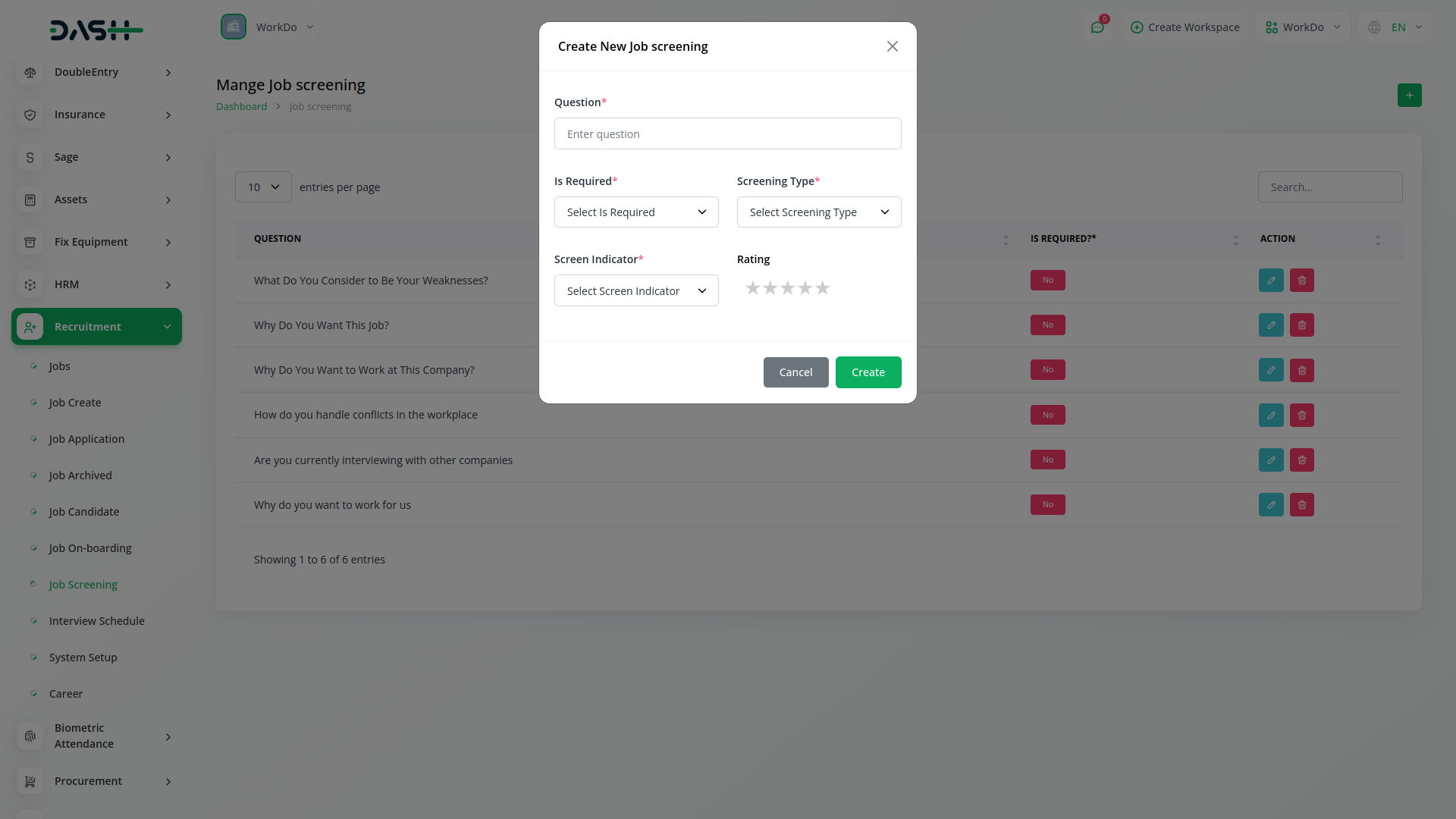 The Job Screening page allows users to configure screening criteria, such as mandatory fields, screening types, indicators, and ratings. By setting specific parameters for candidate evaluation, users can effectively assess the suitability of applicants, ensuring that only the most qualified candidates move forward in the recruitment process. This functionality enhances the overall efficiency and effectiveness of the recruitment efforts.